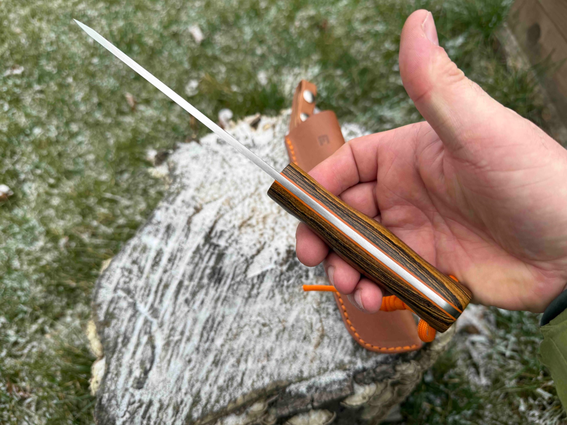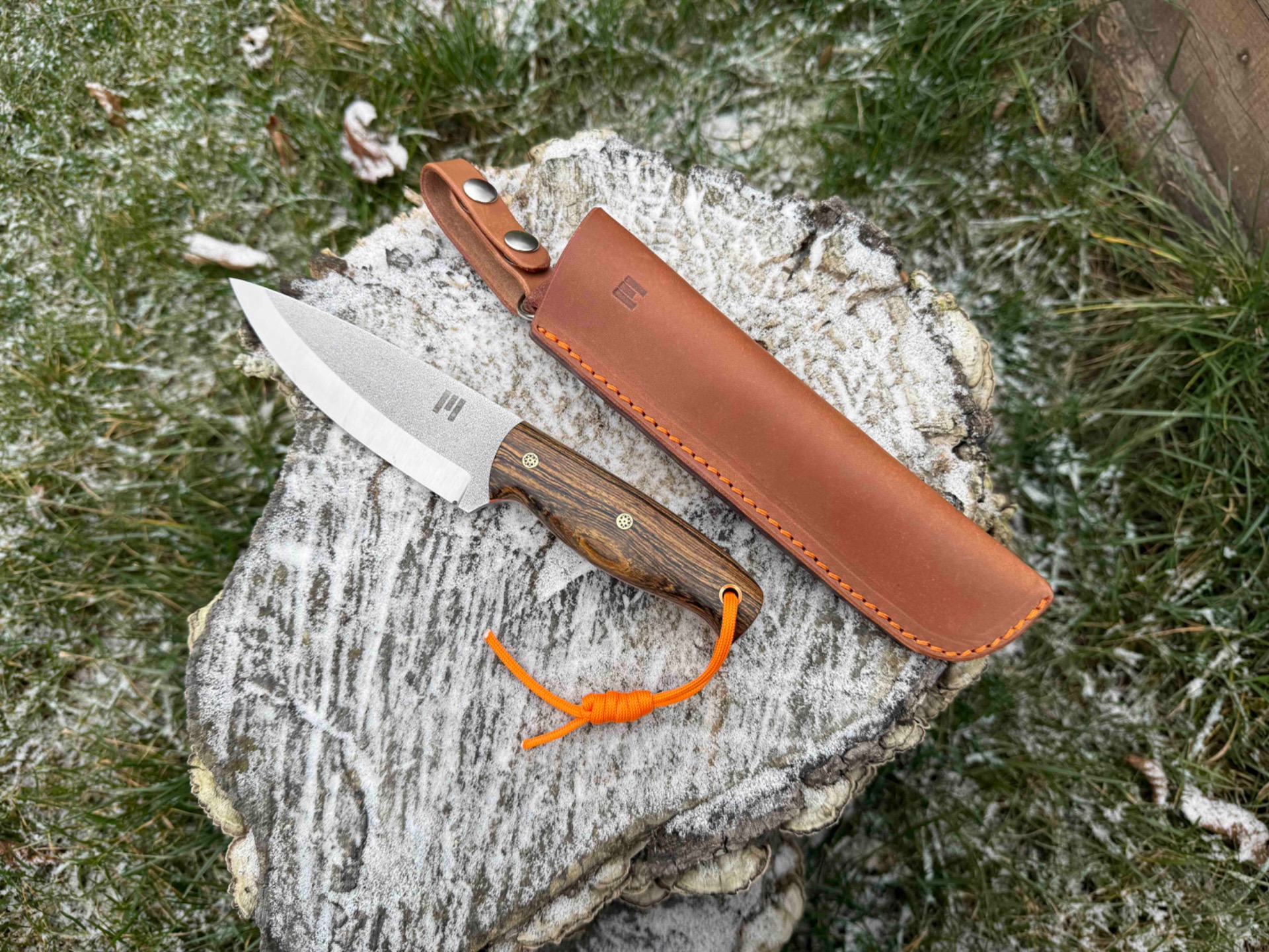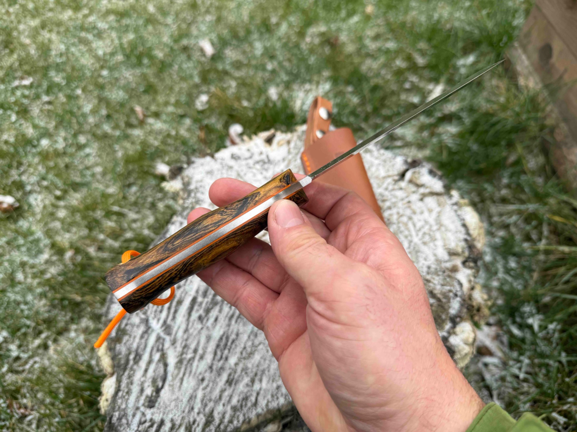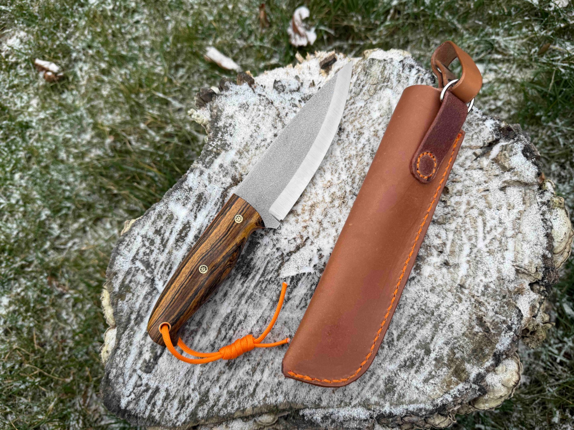 Ručka je z tropického dřeva bocote, které má krásnou kresbu, fíbr je oranžový v materiálu G10, okrasané piny a kožené toulcové pouzdro z hovězí kůže.
