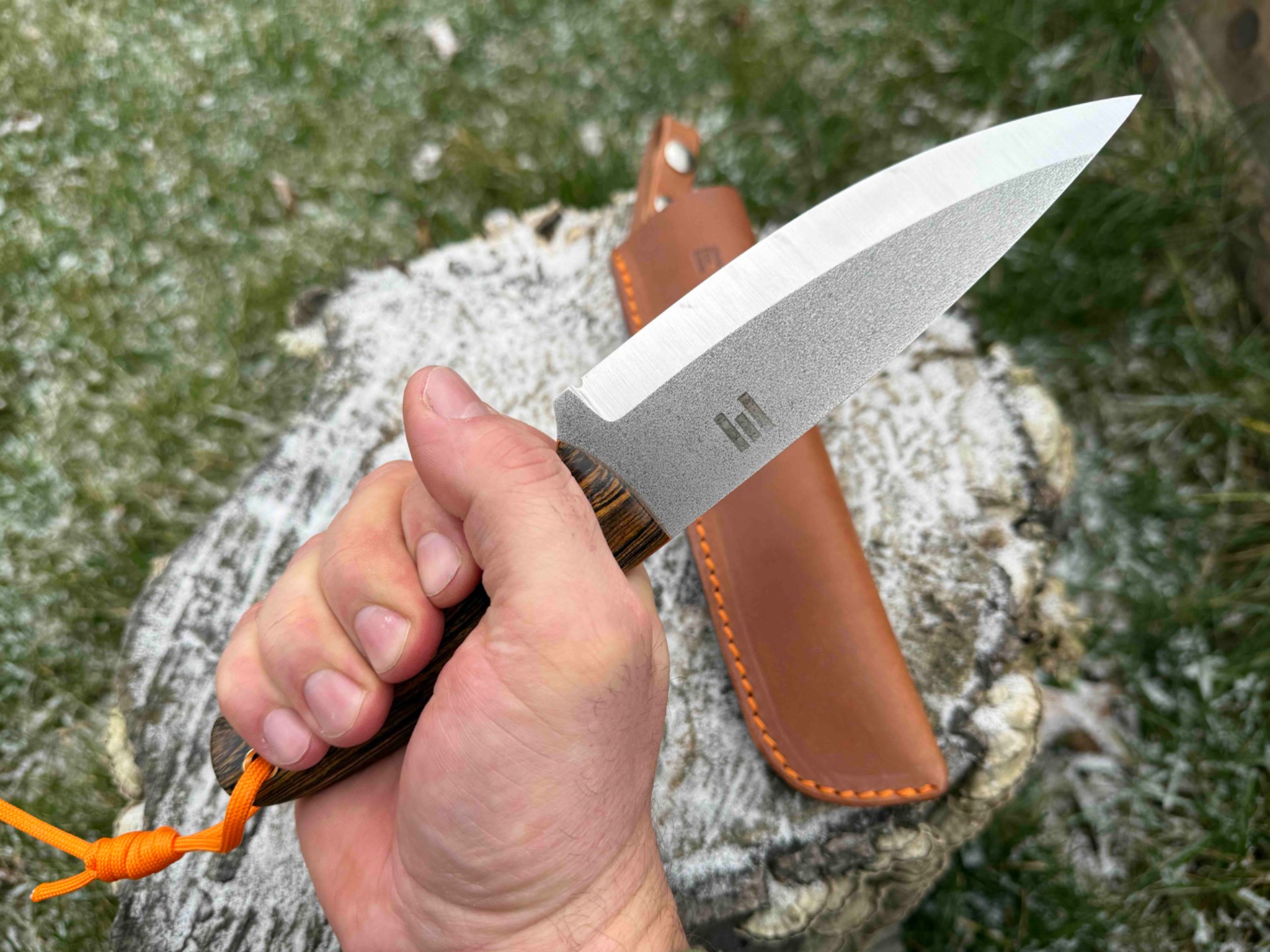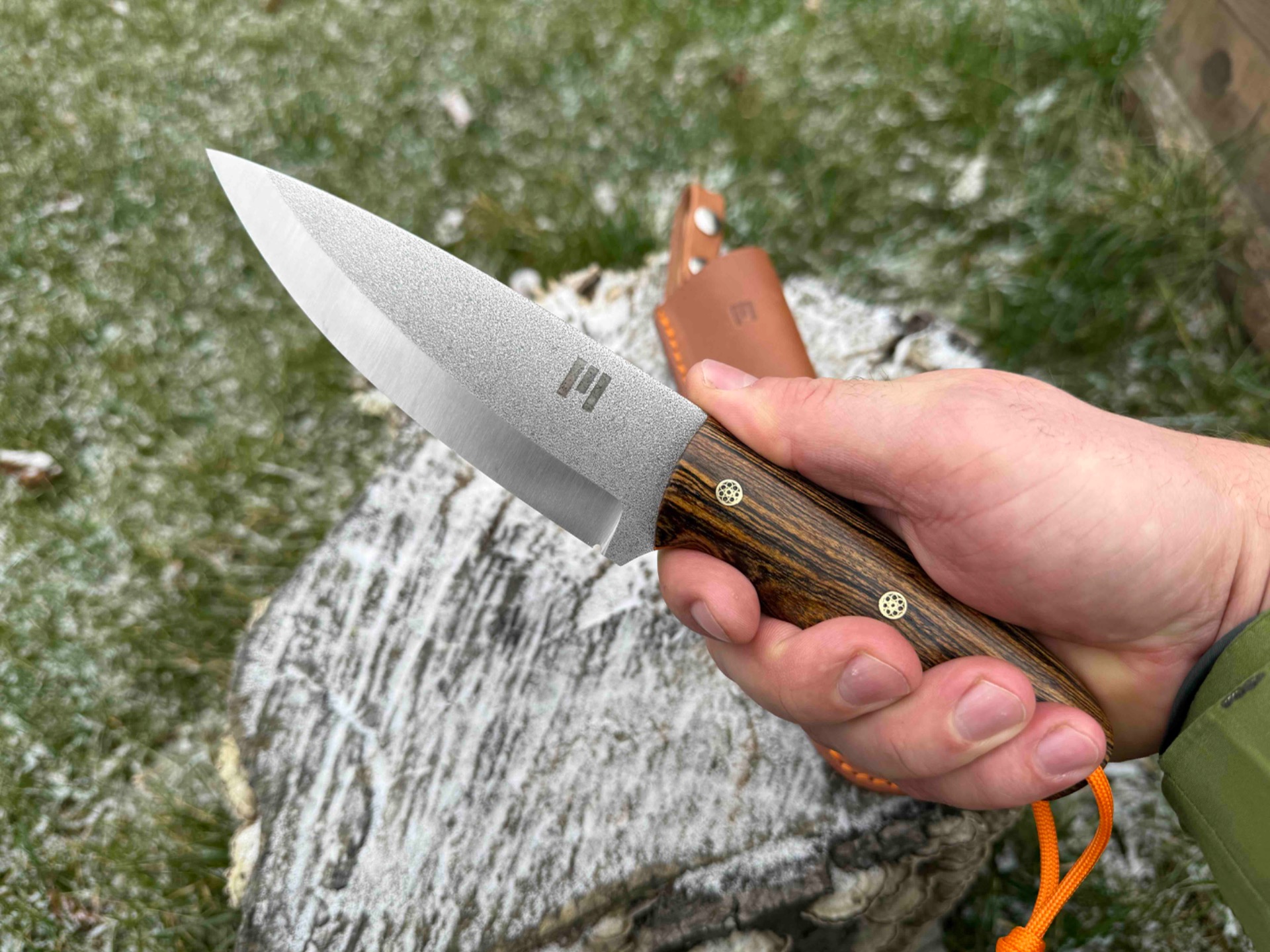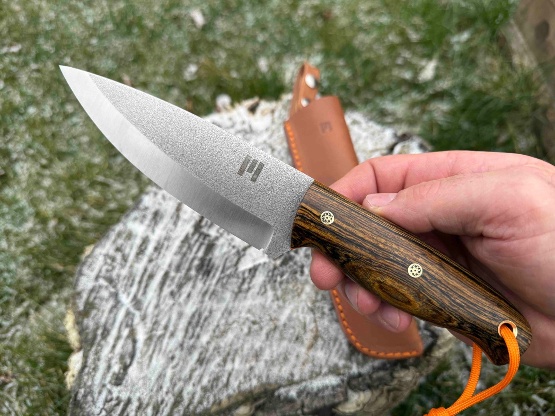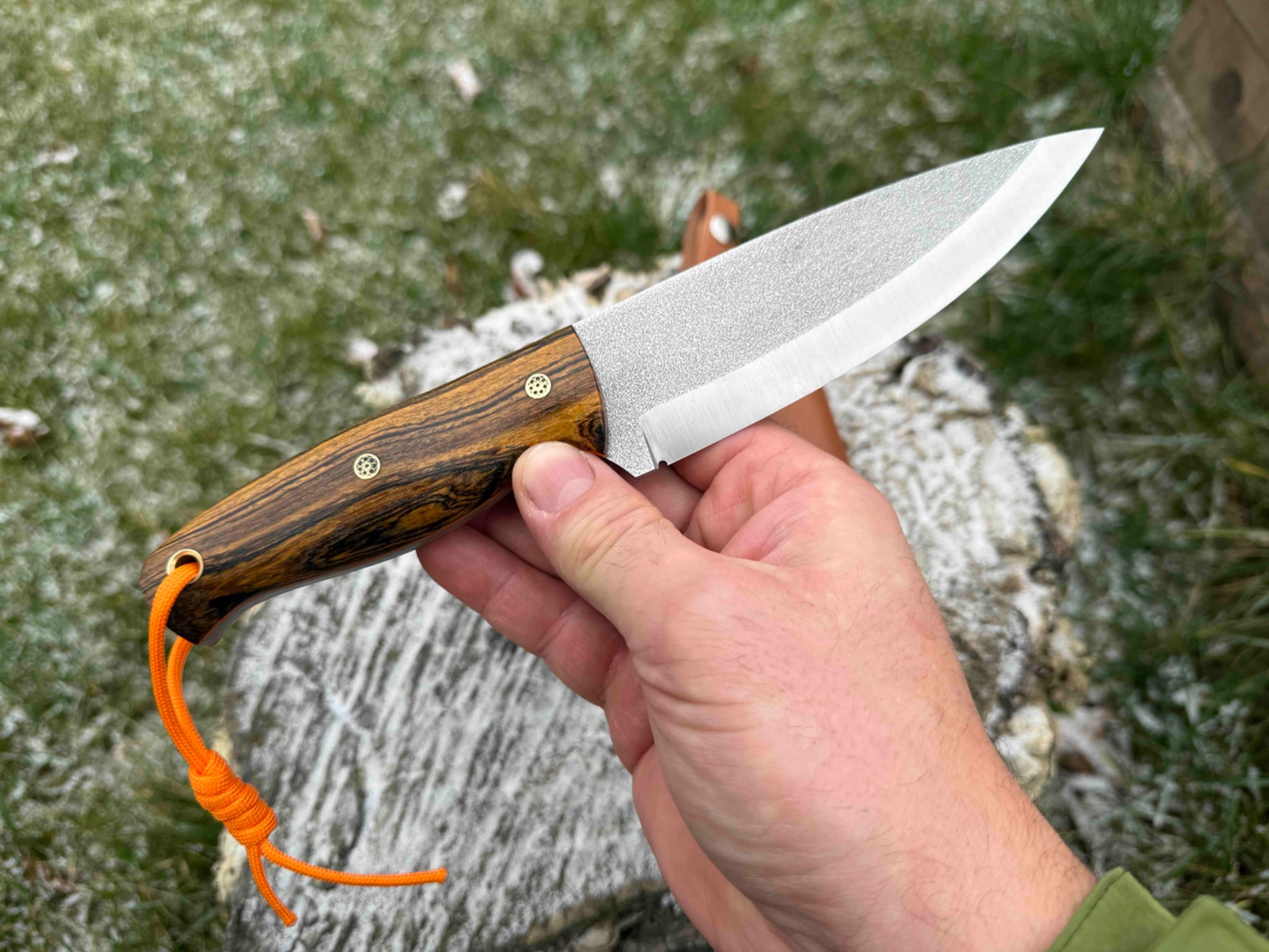 Ručka je z tropického dřeva bocote, které má krásnou kresbu, fíbr je oranžový v materiálu G10, okrasané piny a kožené toulcové pouzdro z hovězí kůže.