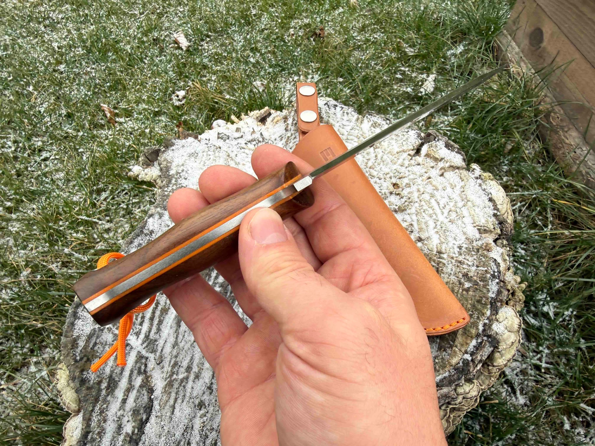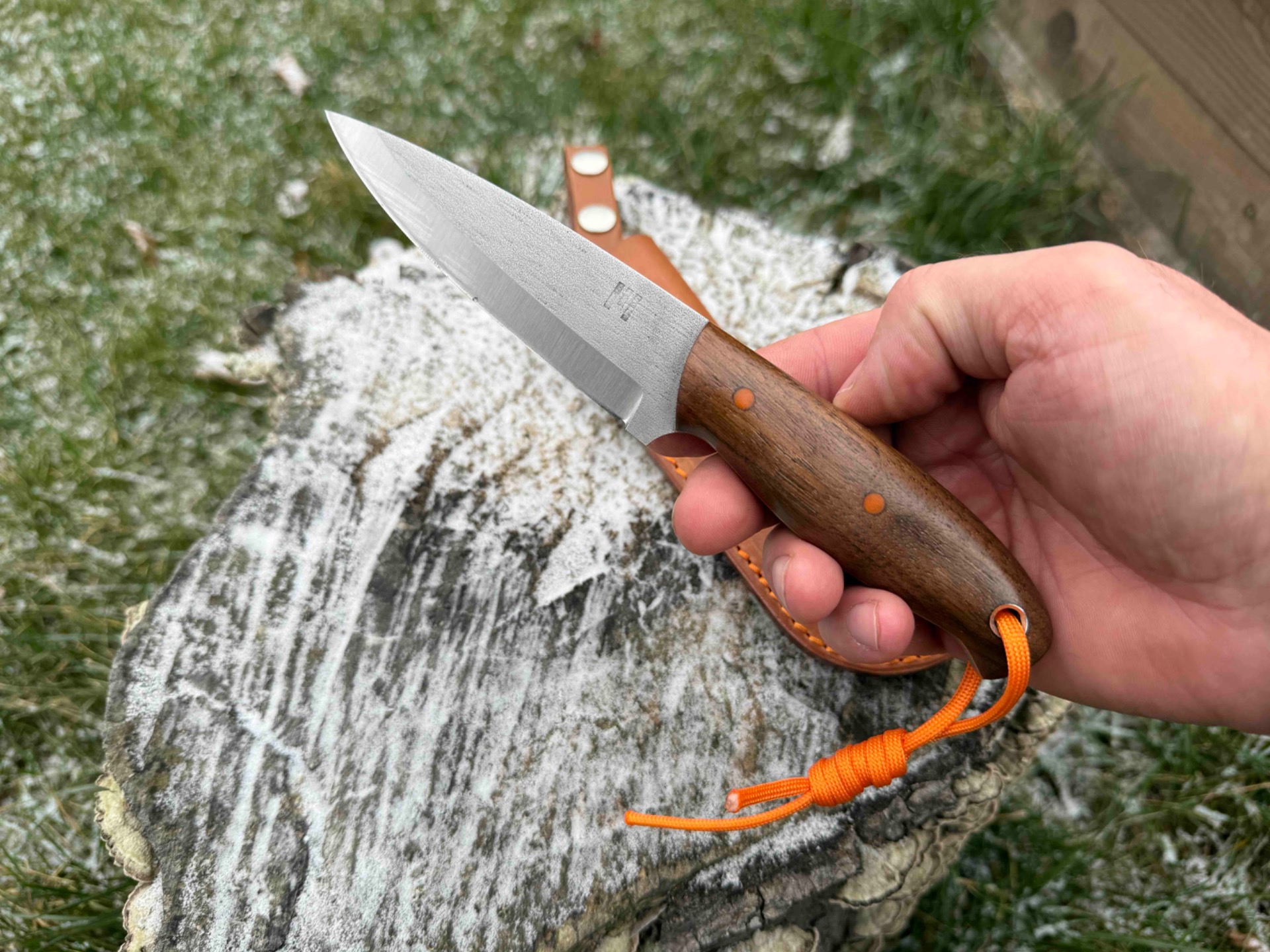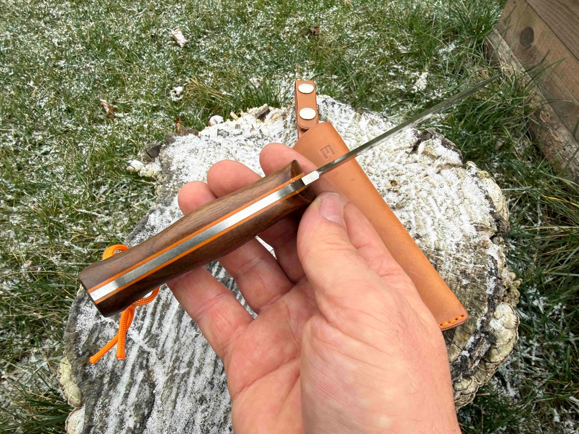Ručka je z tureckého ořechu. Piny jsou z materiálu G10 stejně jako fíbr v oranžové barvě.
