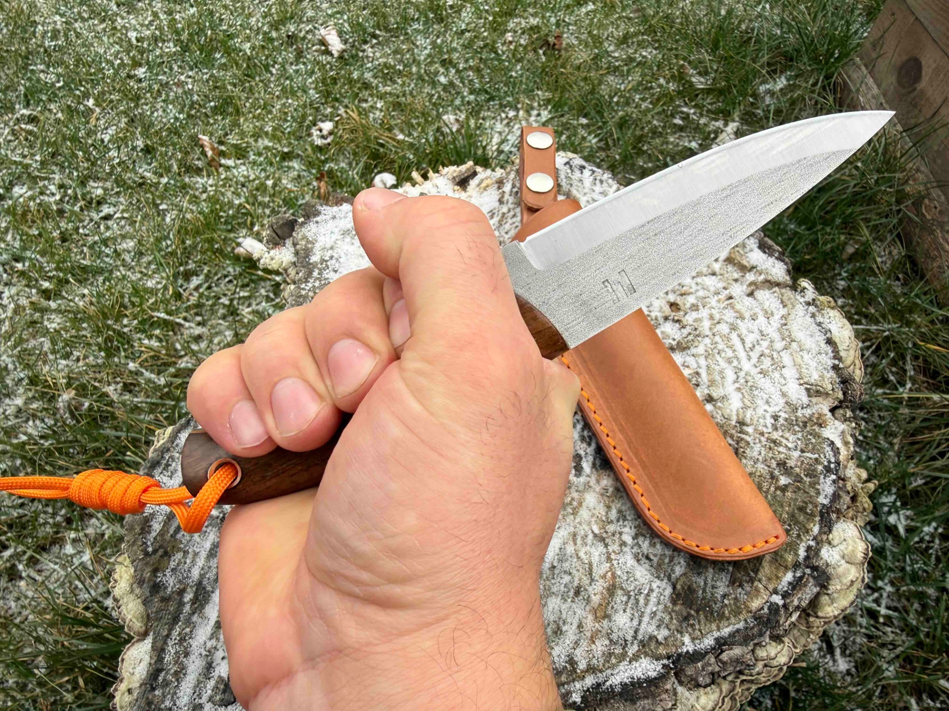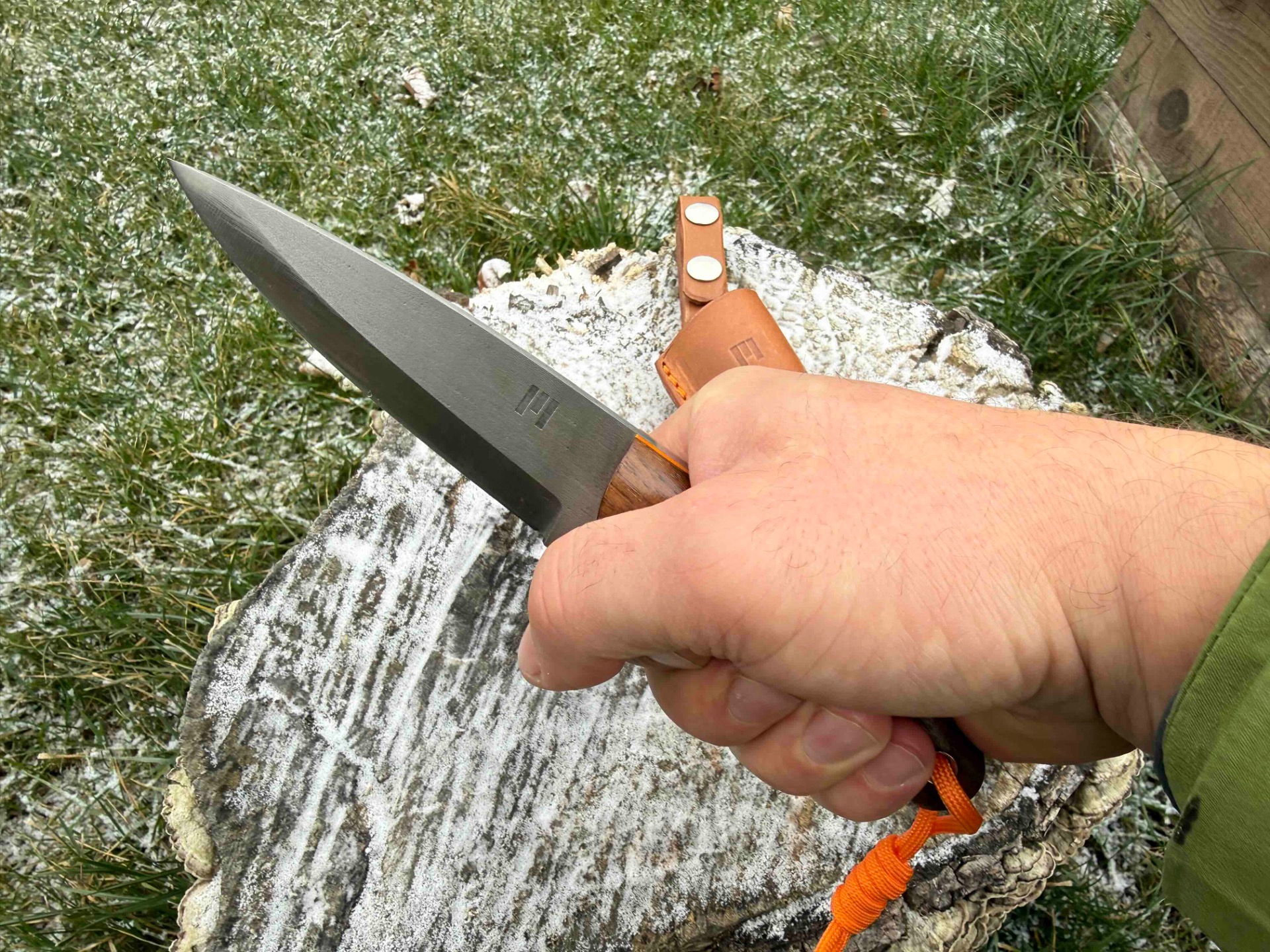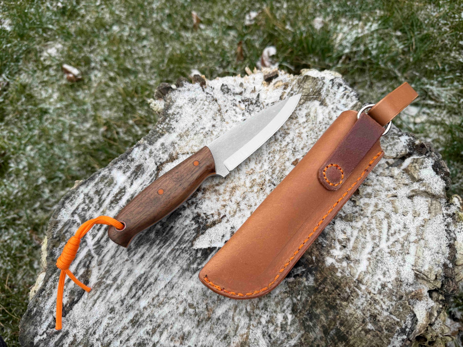 Ručka je z tureckého ořechu. Piny jsou z materiálu G10 stejně jako fíbr v oranžové barvě.