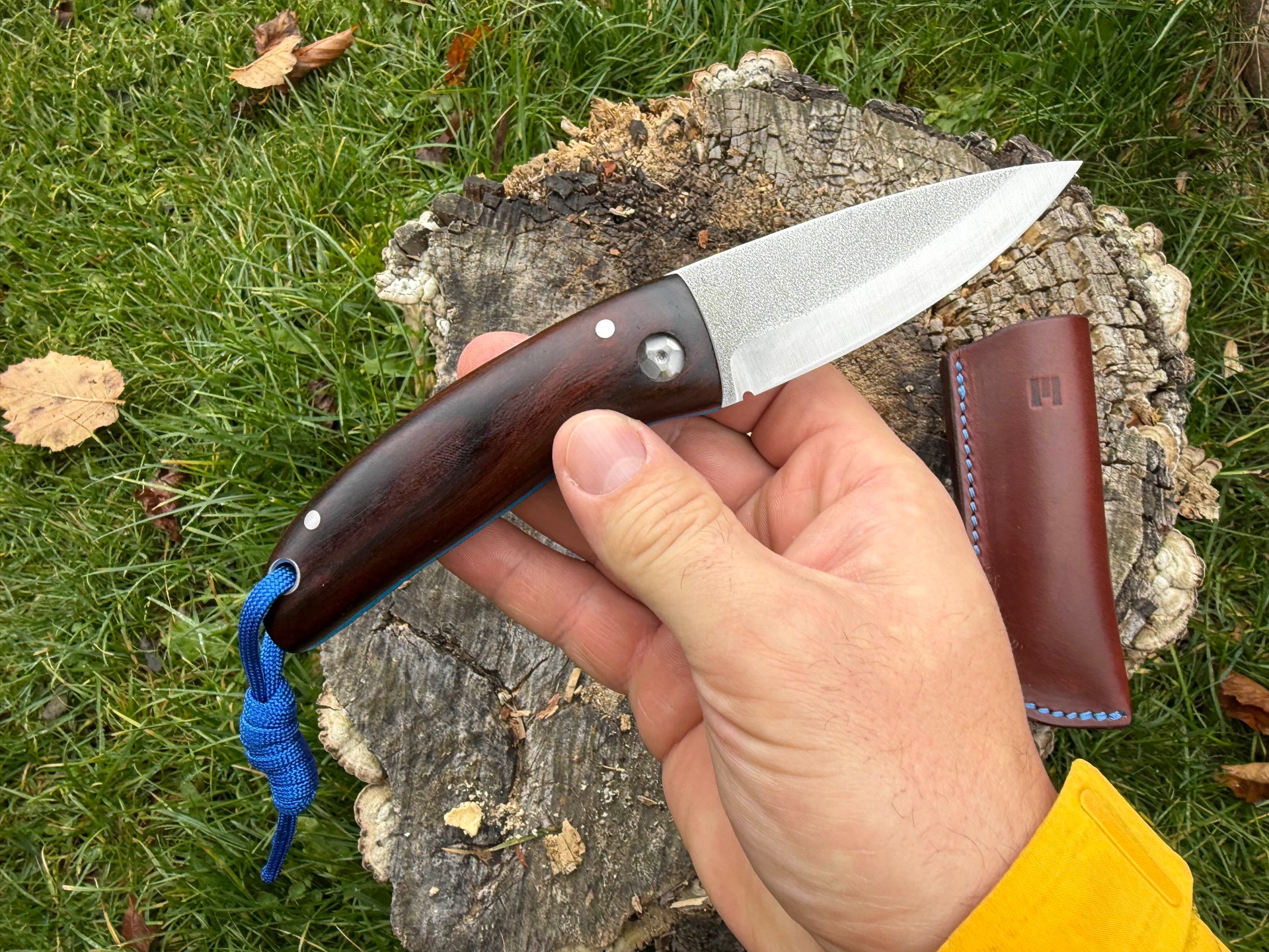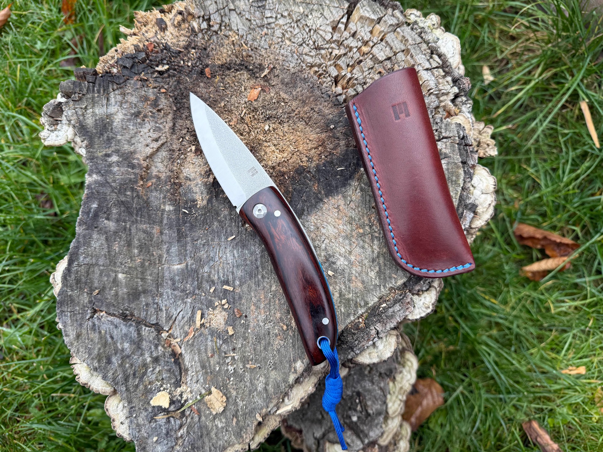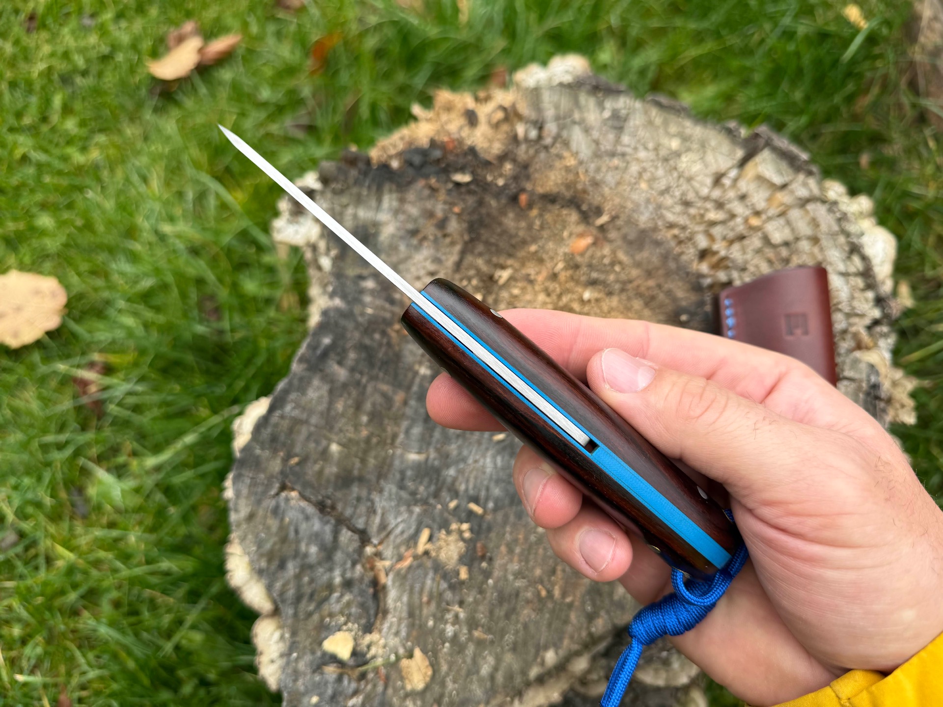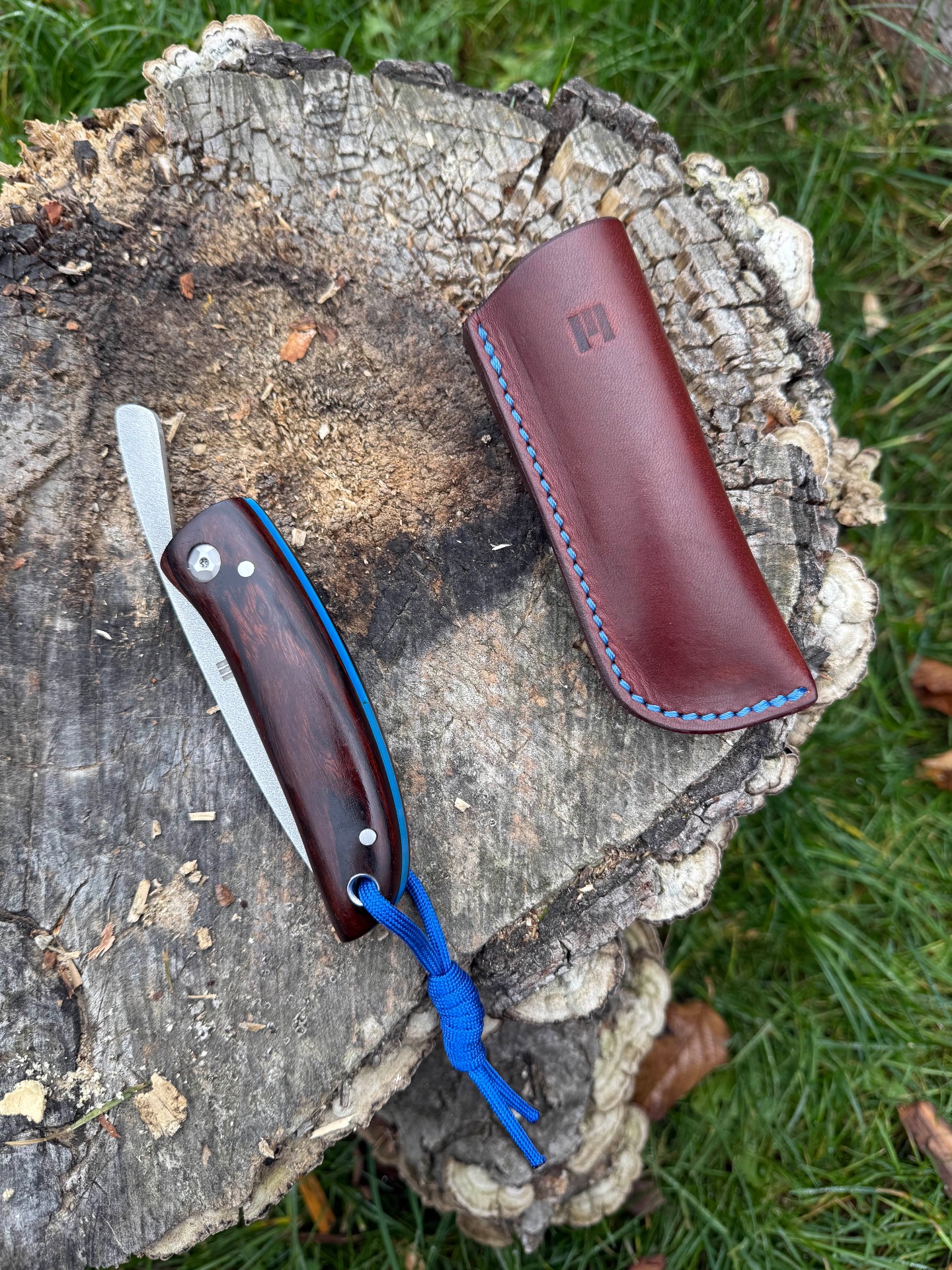 Ručka je vyrobena z dřeva Ironwood kterému se také říká železné pouštní dřevo, které roste opravu v poušti a je neskutečně tvrdé. Ručka je dál doplněna o designový modrý fíbr, který krásně vynikne. V ceně je kožené pouzdro s modrým prošitím.