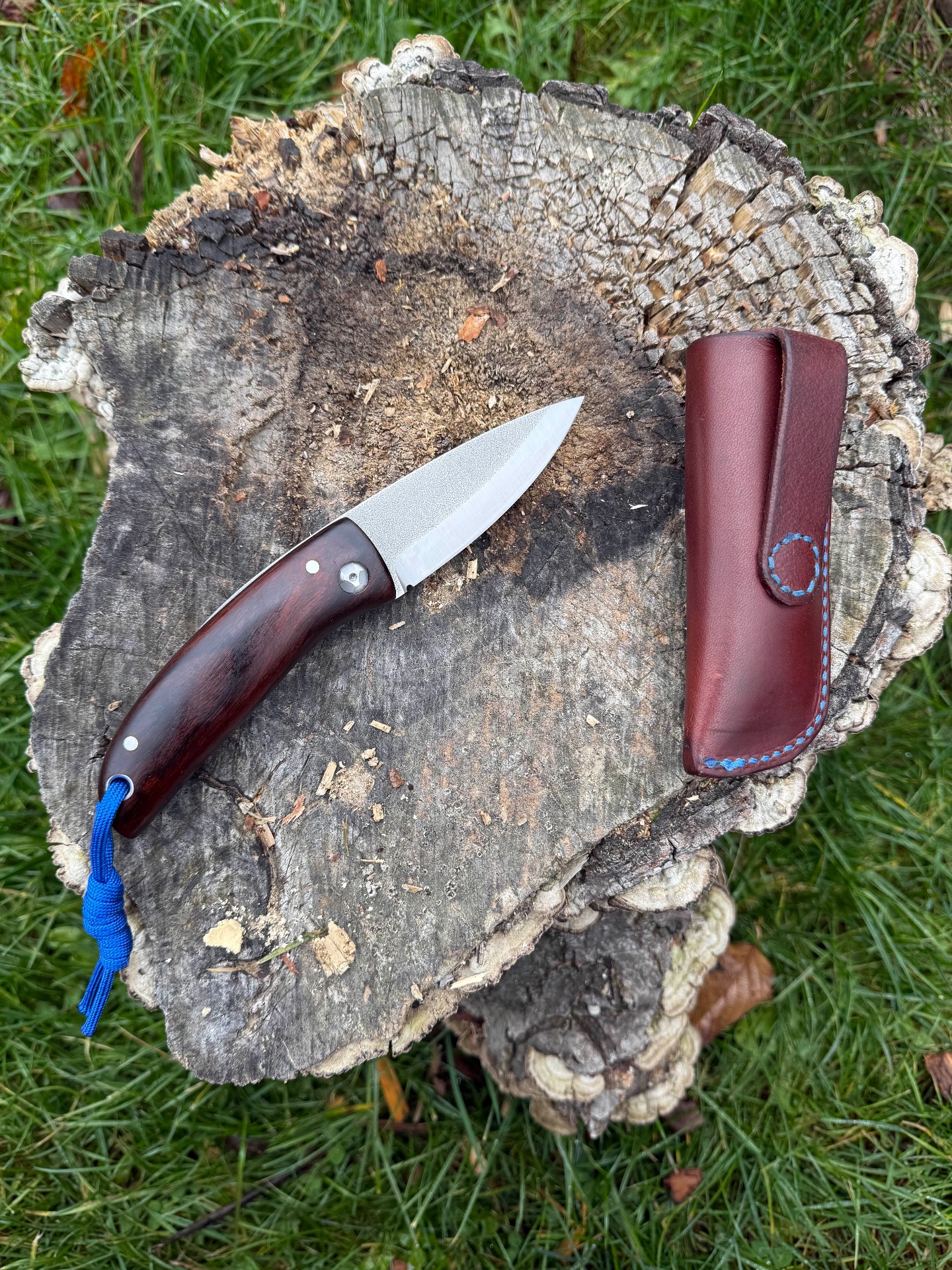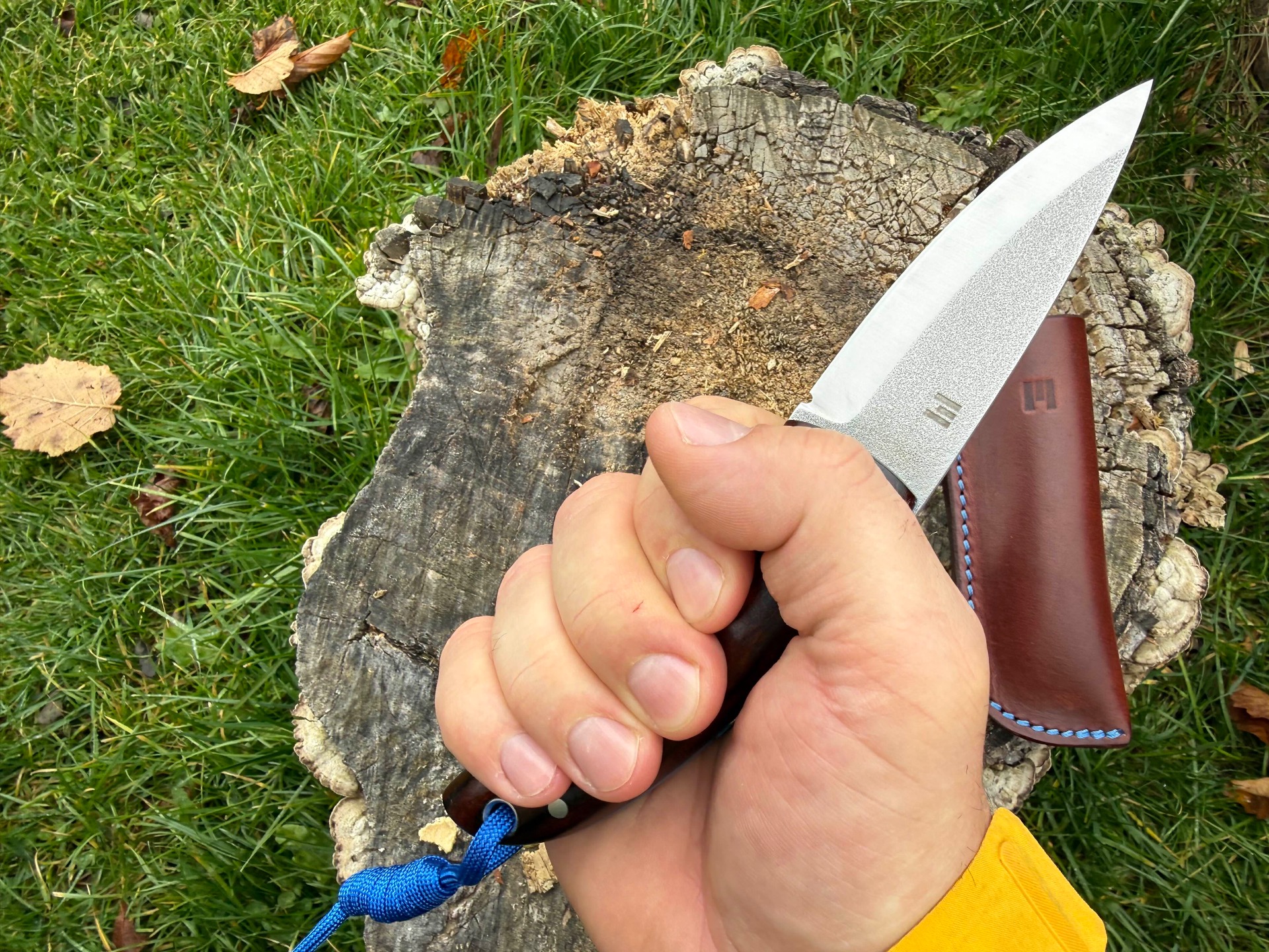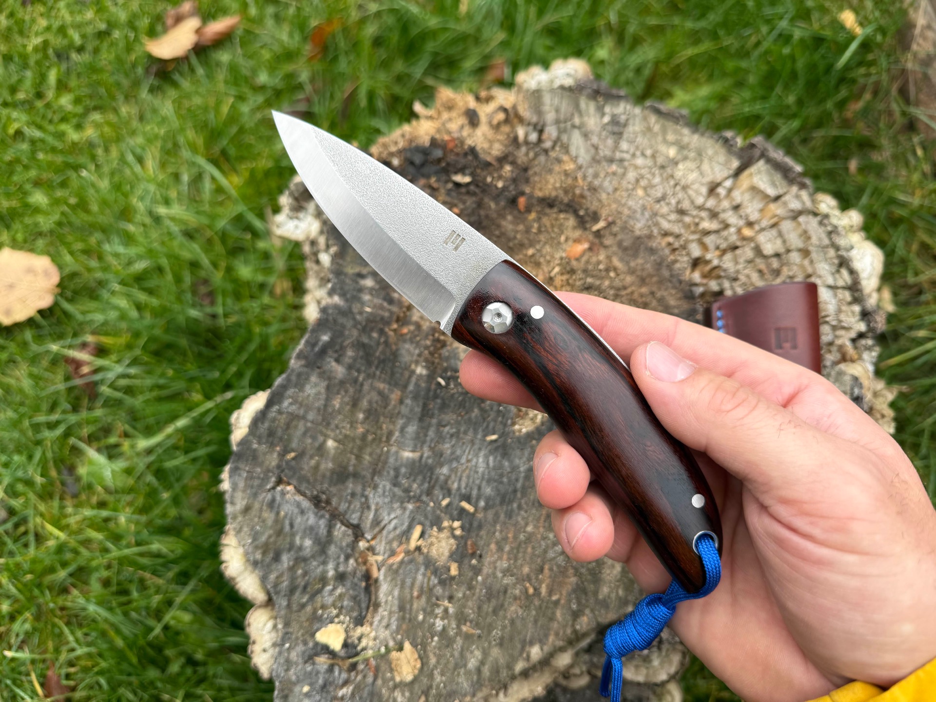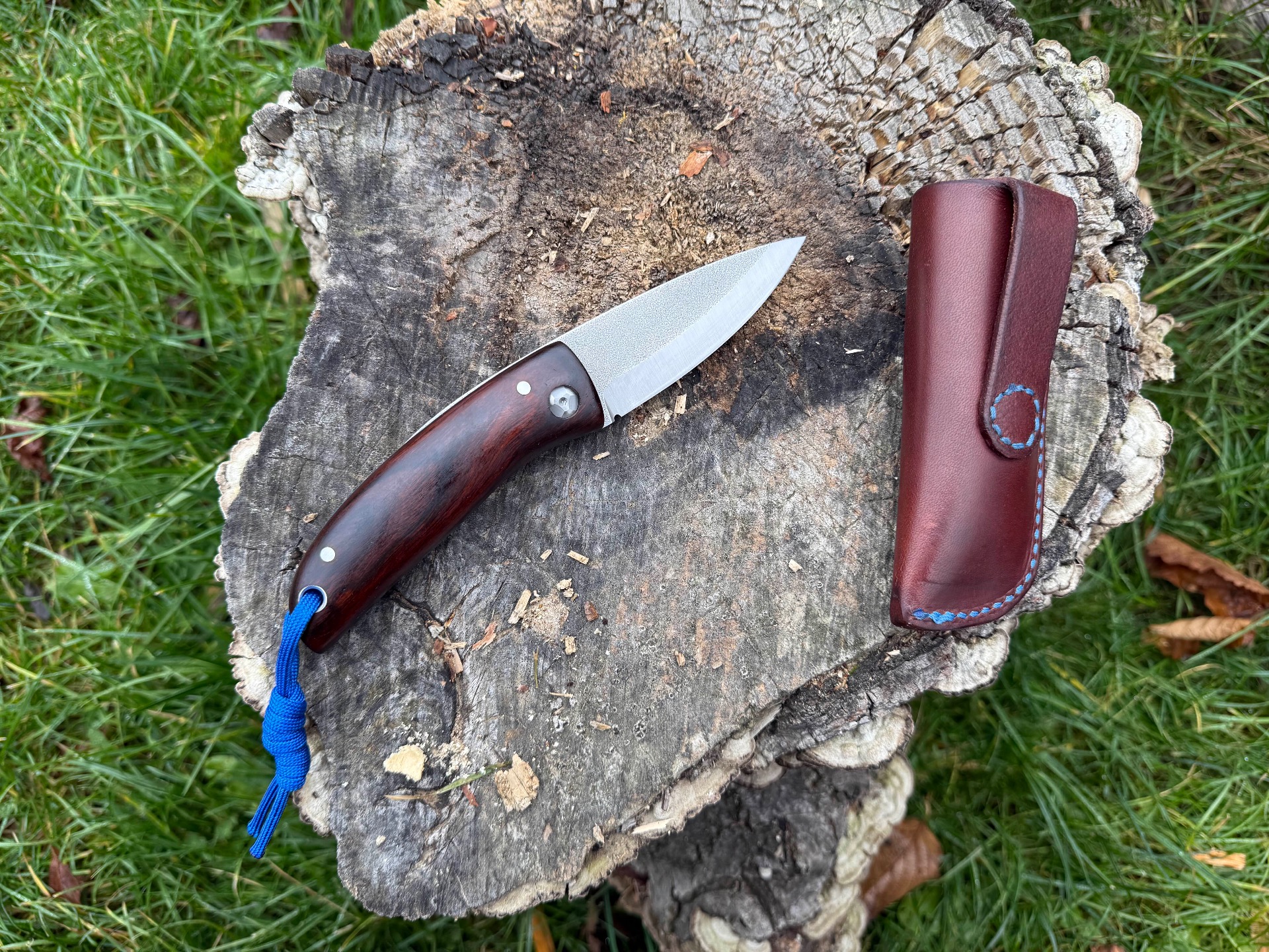 Ručka je vyrobena z dřeva Ironwood kterému se také říká železné pouštní dřevo, které roste opravu v poušti a je neskutečně tvrdé. Ručka je dál doplněna o designový modrý fíbr, který krásně vynikne. V ceně je kožené pouzdro s modrým prošitím.