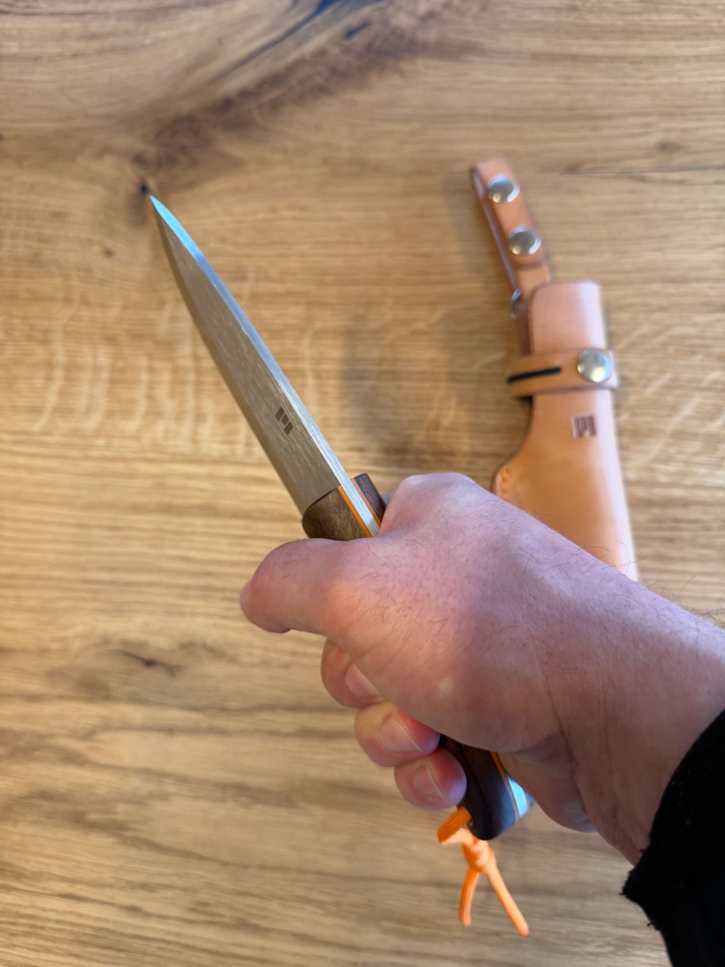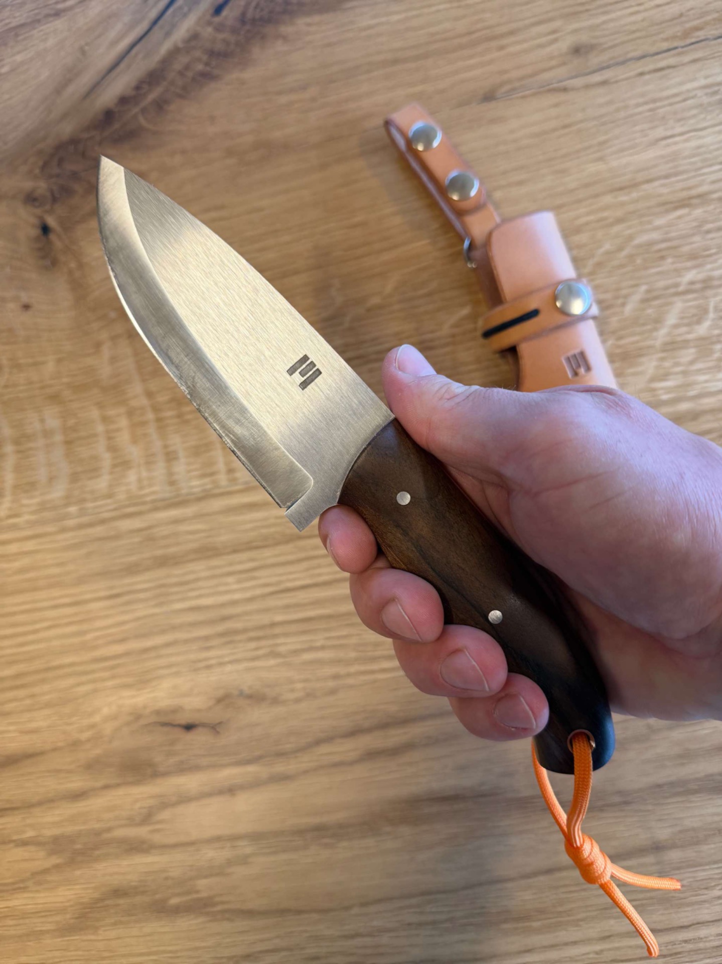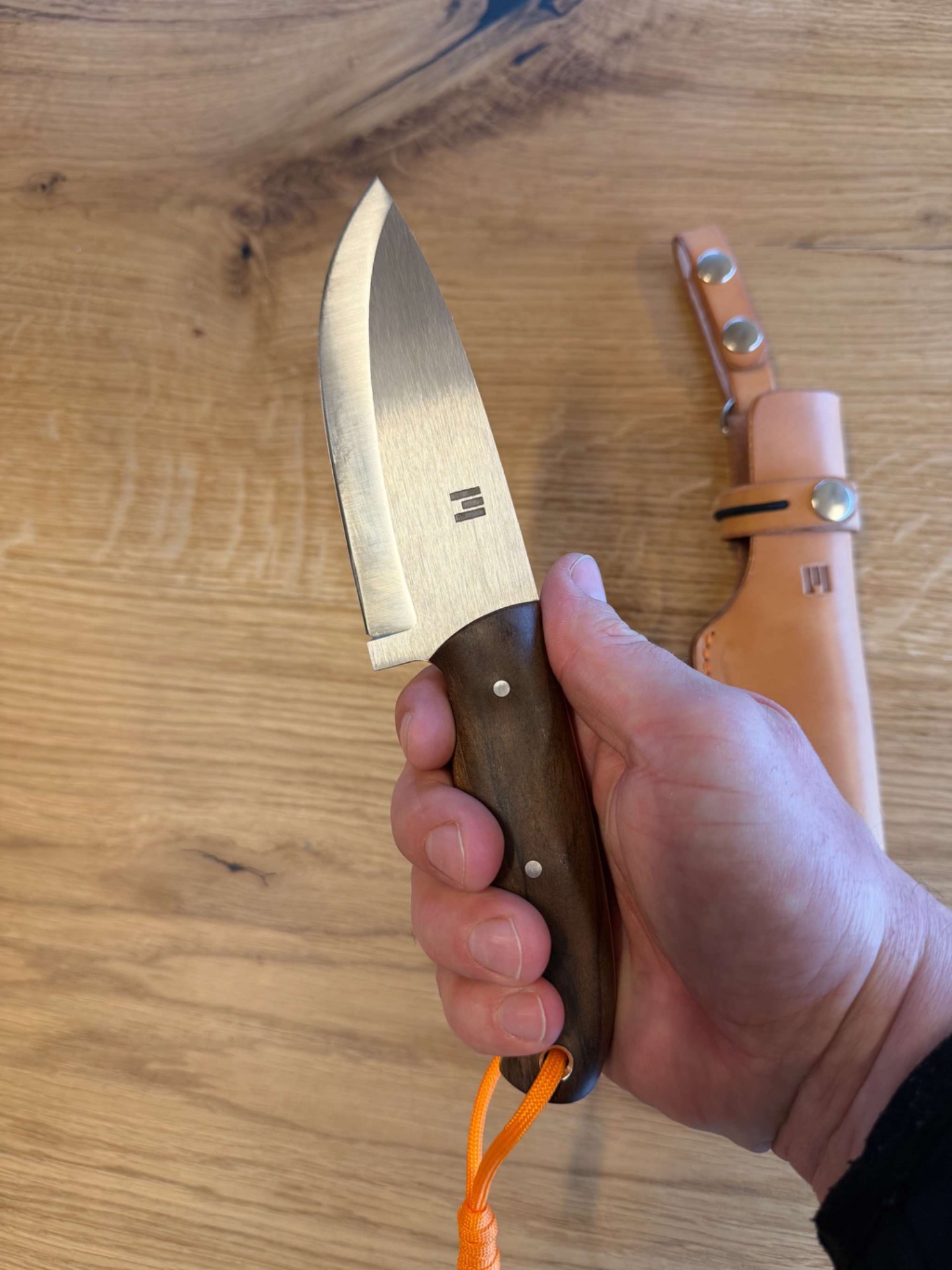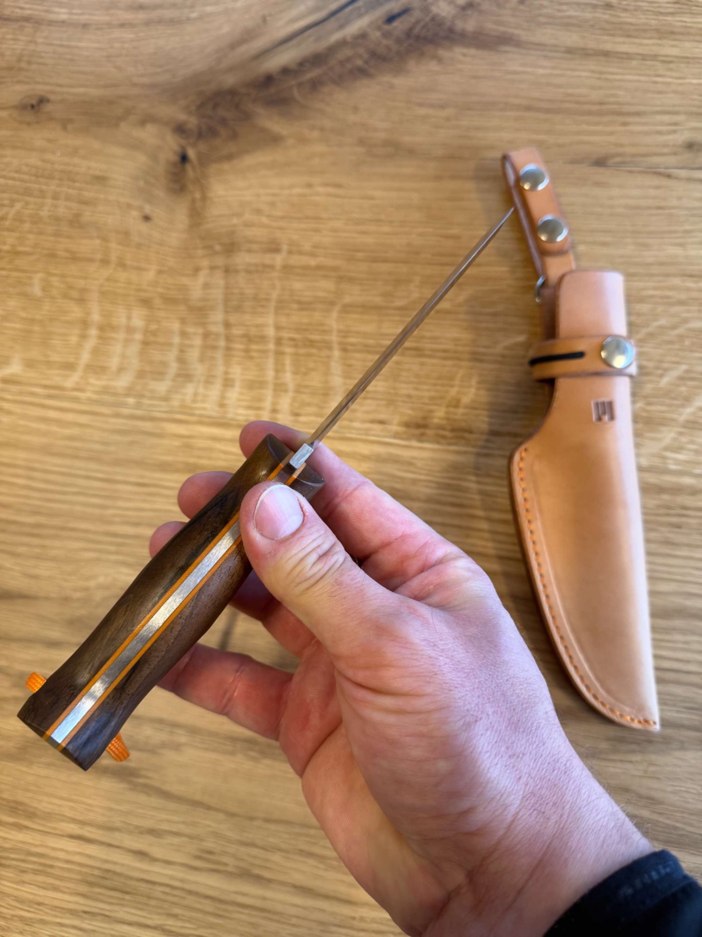 Ručka je ze stabilizovaného ořechu, takže tento materiál nesaje téměř vůbec vodu nebo vlhkost, piny jsou nerezové a oranžový fíbr z materiálu G-10.
