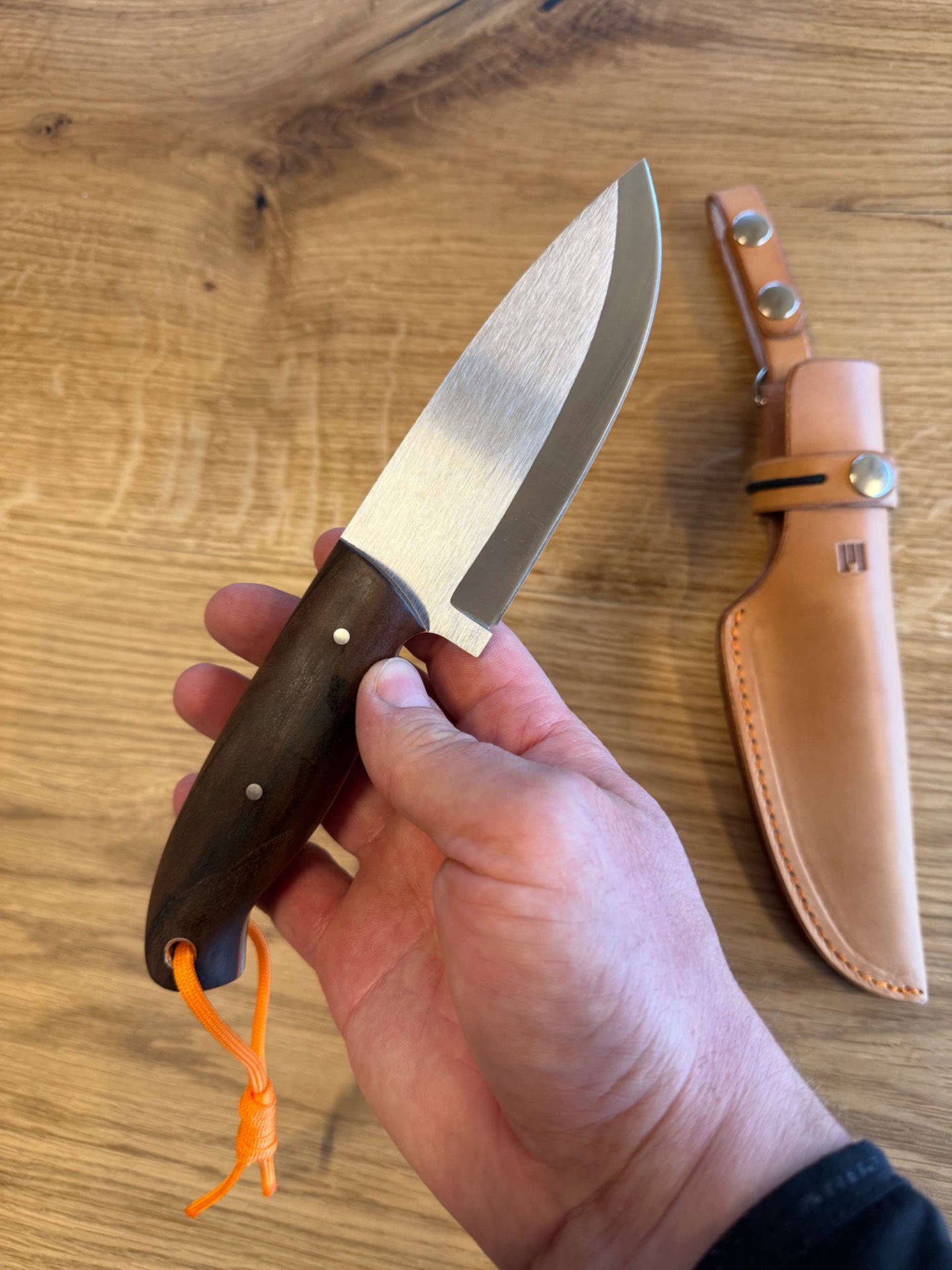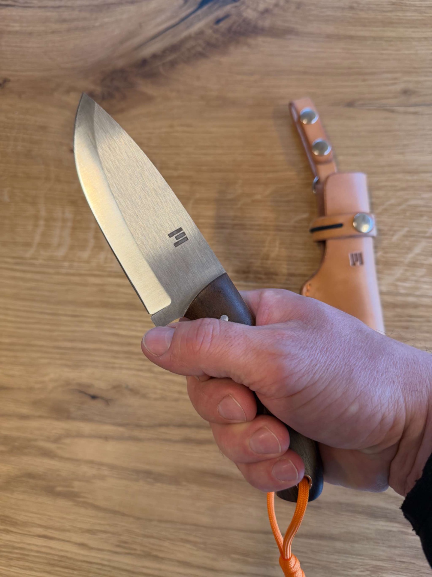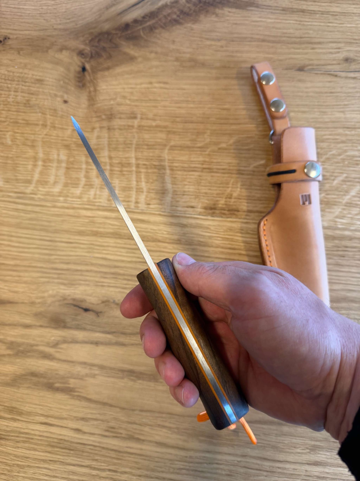 Ručka je ze stabilizovaného ořechu, takže tento materiál nesaje téměř vůbec vodu nebo vlhkost, piny jsou nerezové a oranžový fíbr z materiálu G-10.
