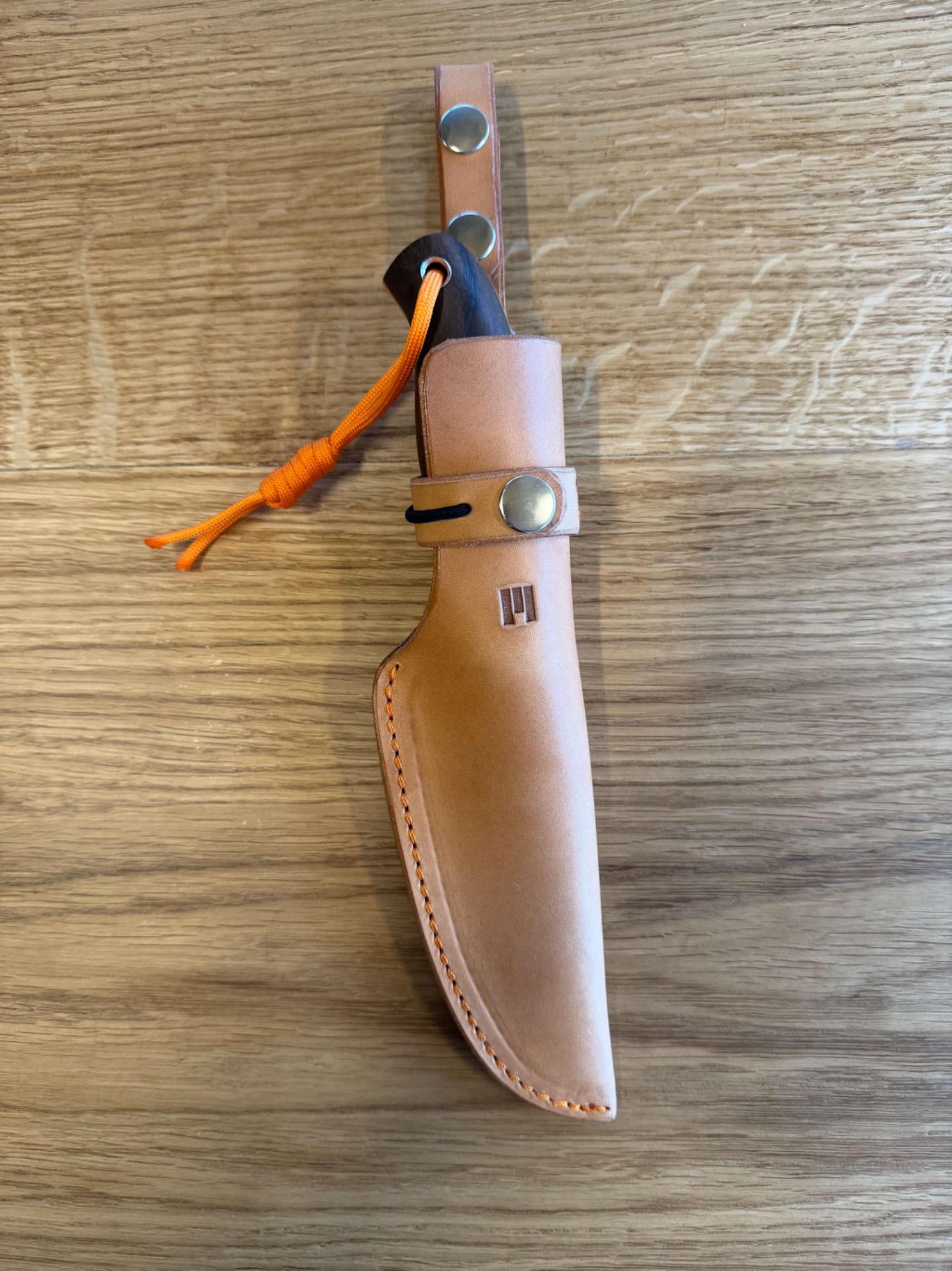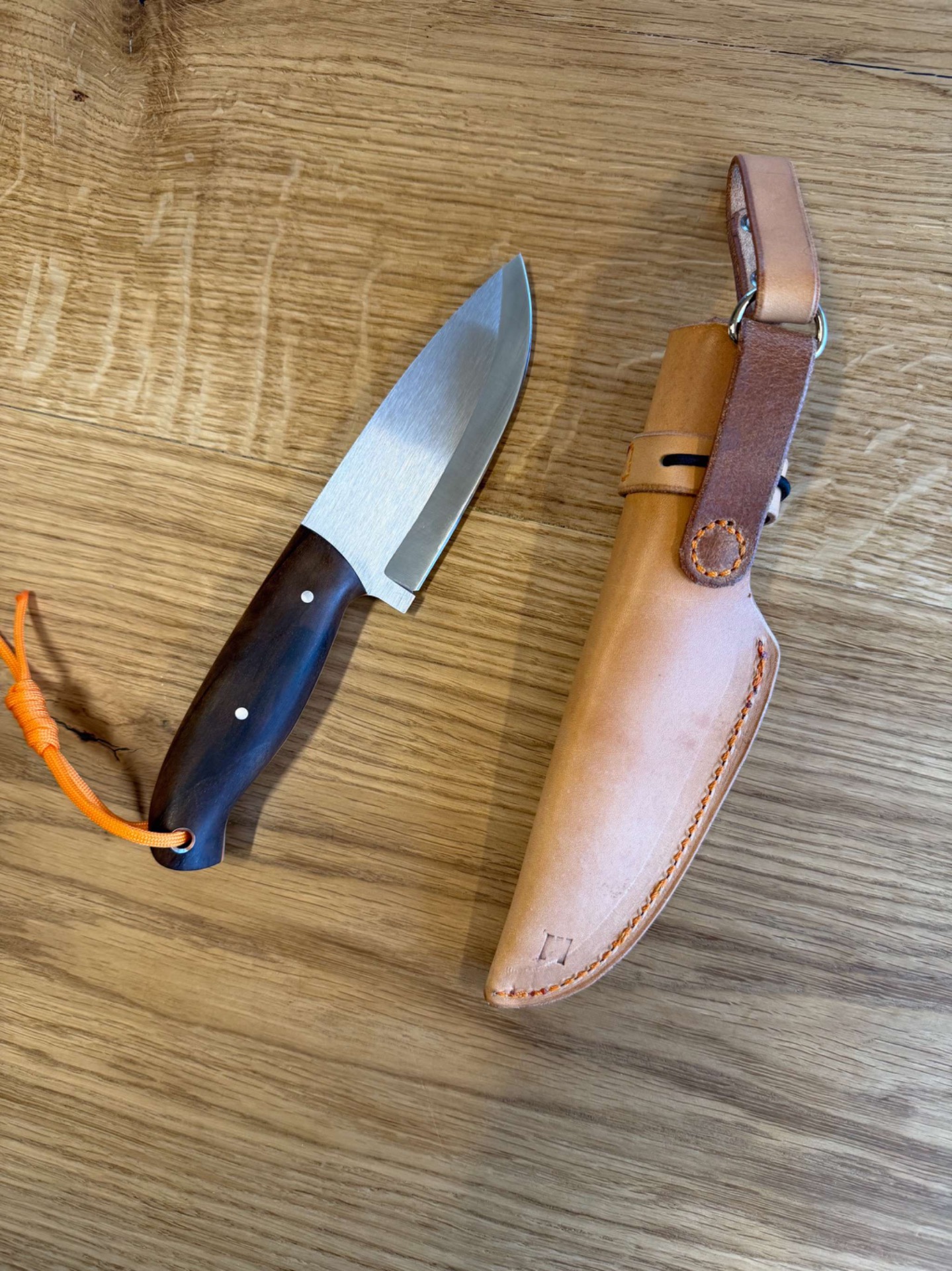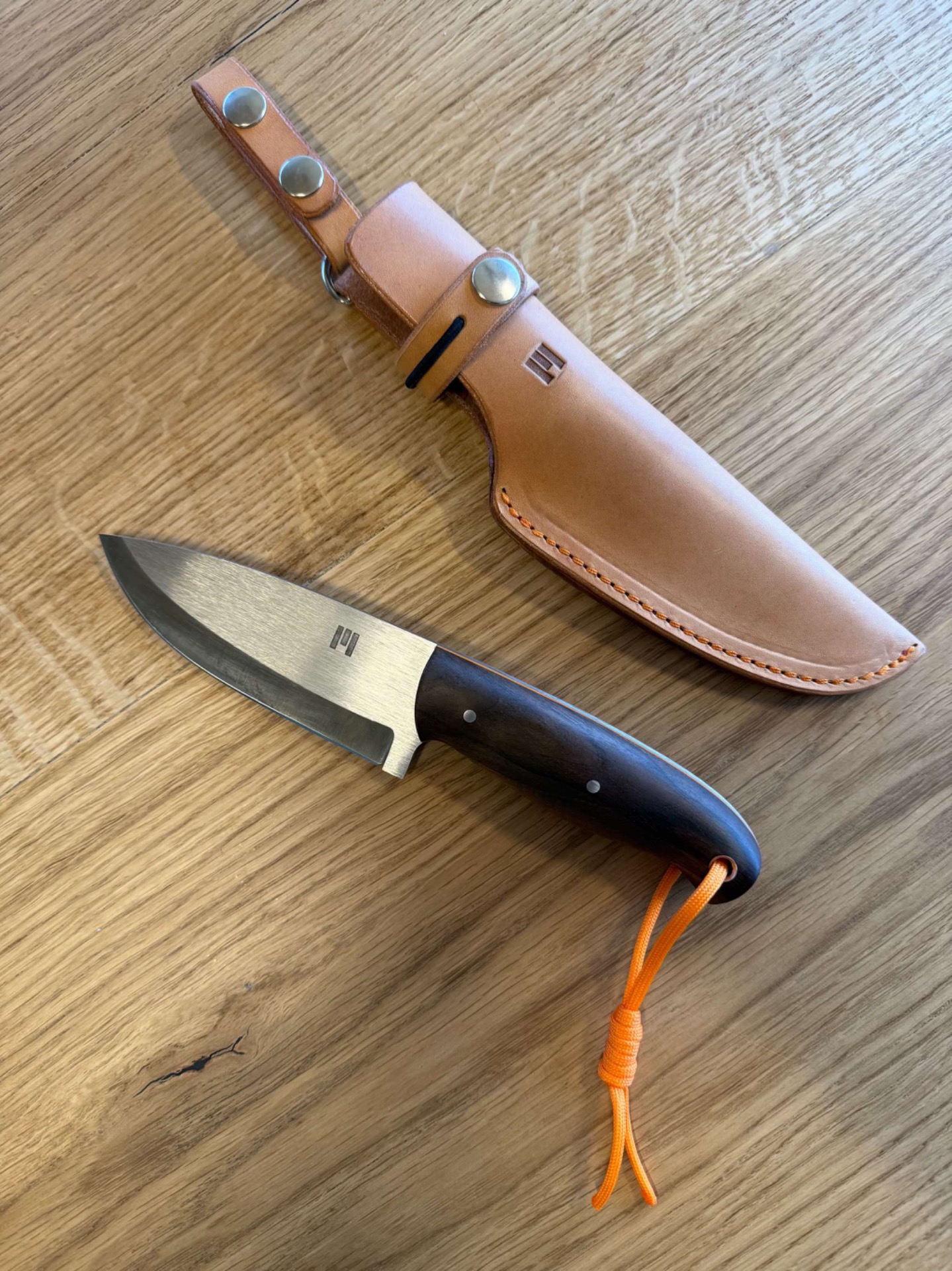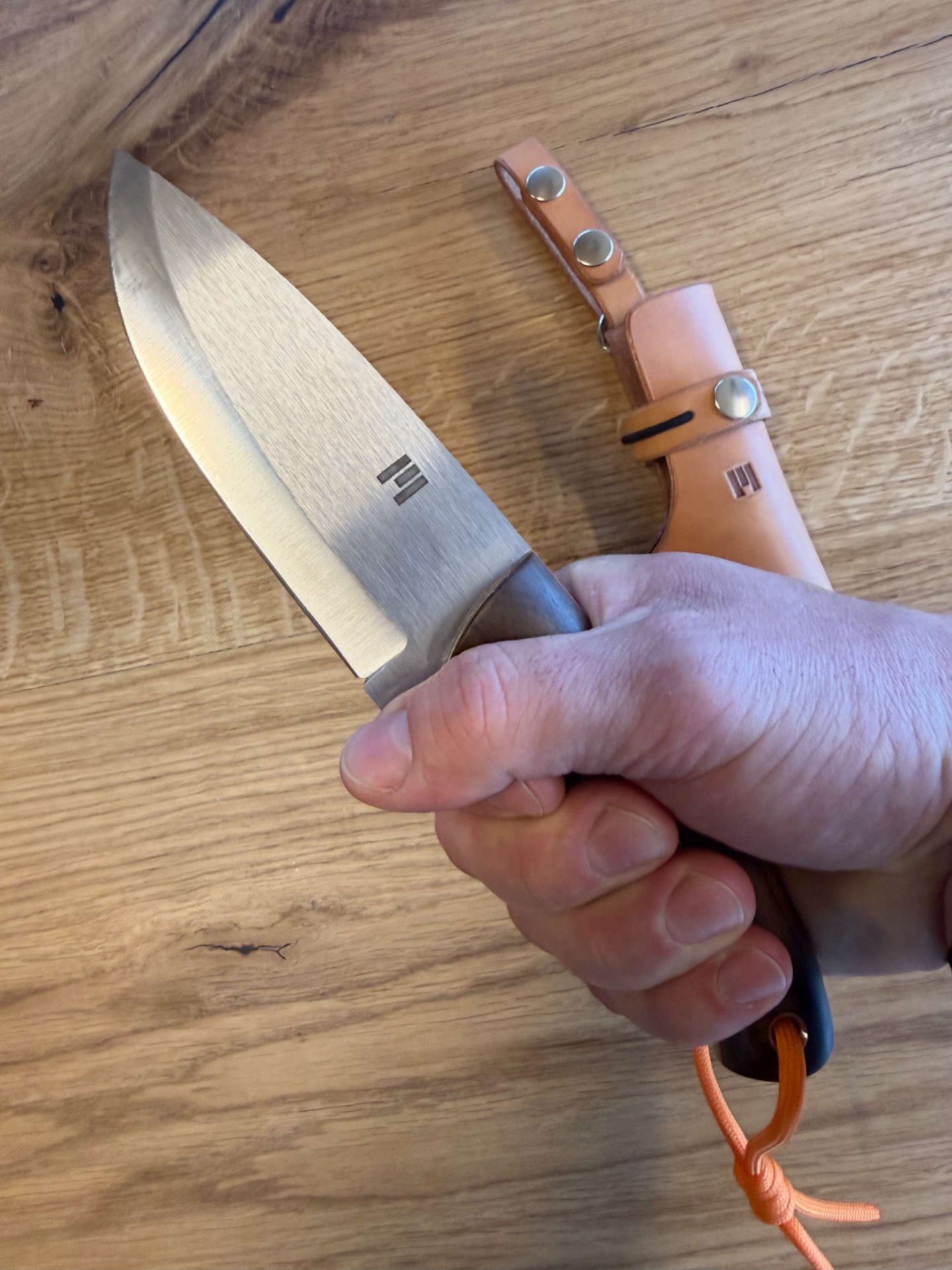Ručka je ze stabilizovaného ořechu, takže tento materiál nesaje téměř vůbec vodu nebo vlhkost, piny jsou nerezové a oranžový fíbr z materiálu G-10.