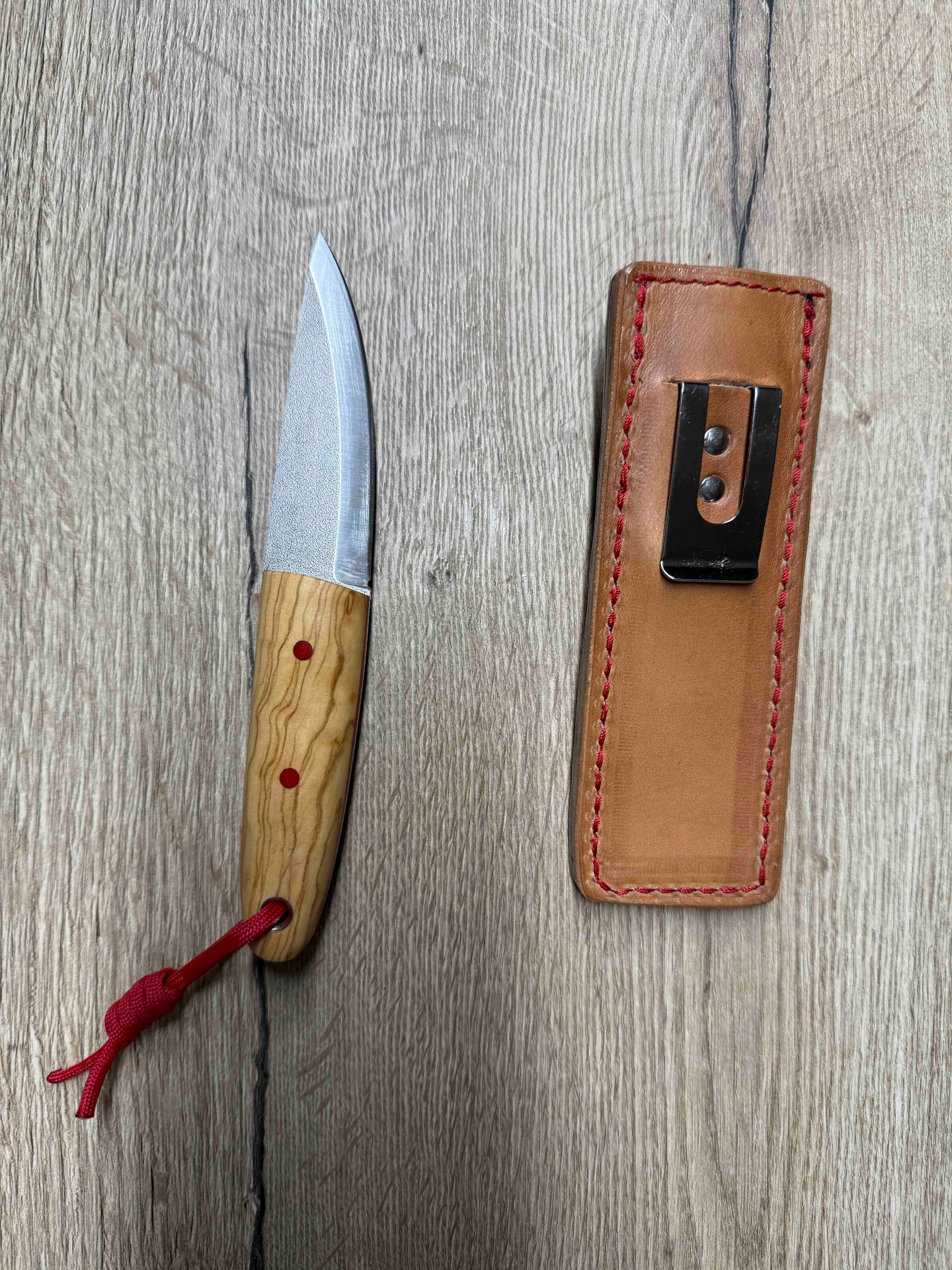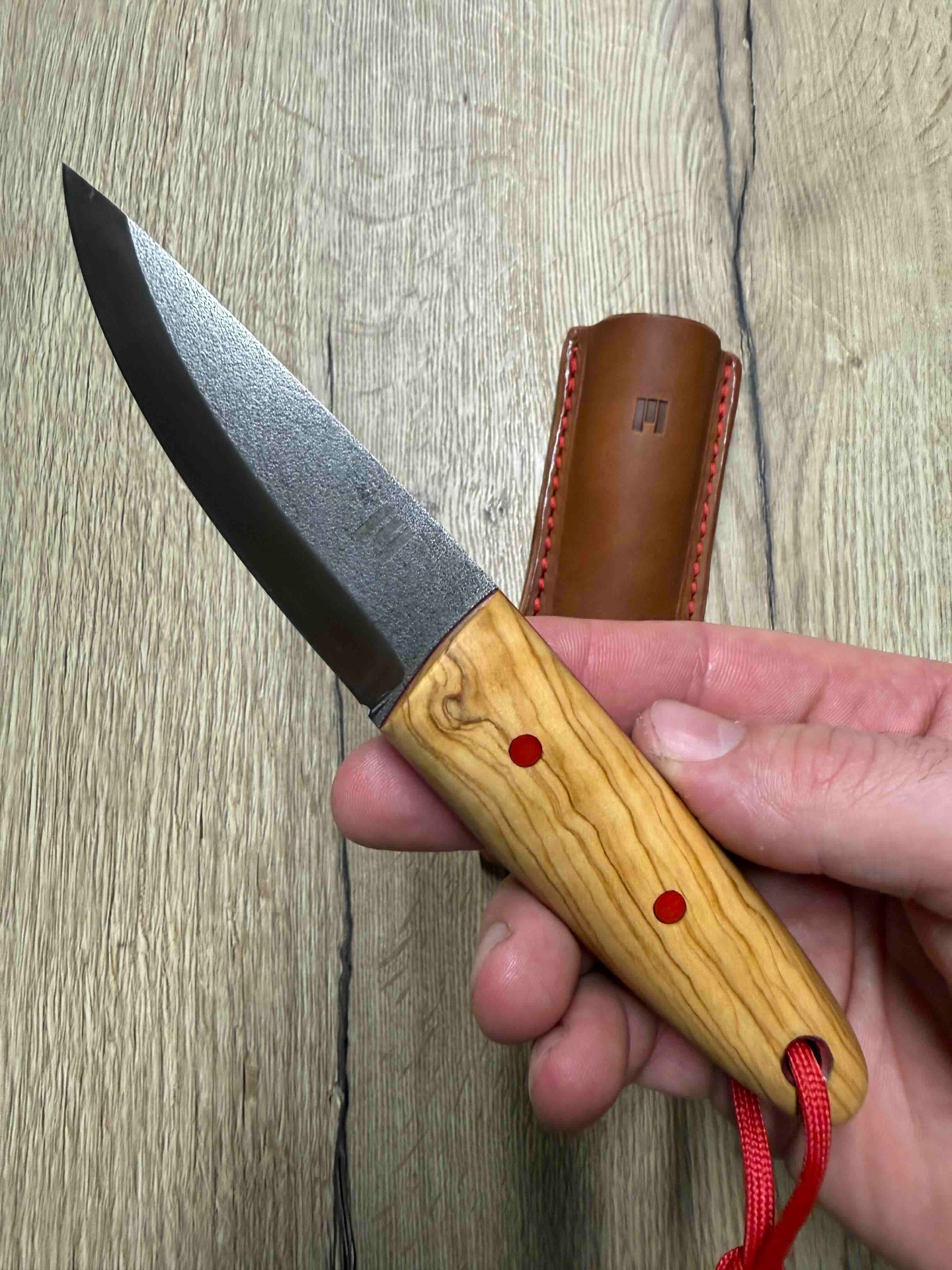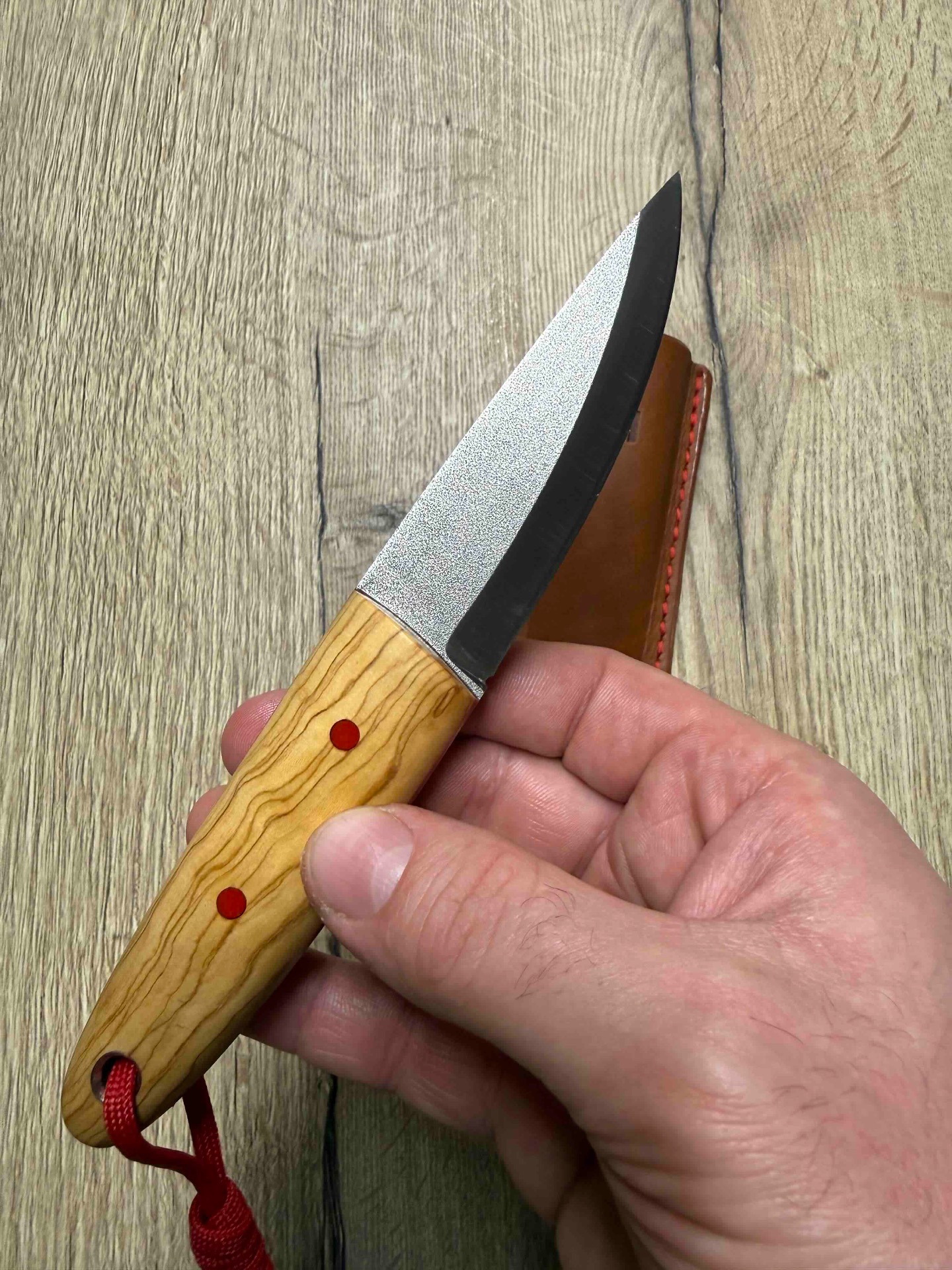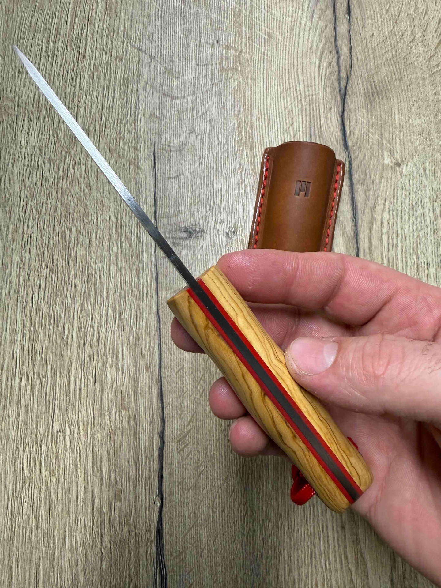 Ručka je z krásného materiálu oliva, G10 piny a červený fíbr.